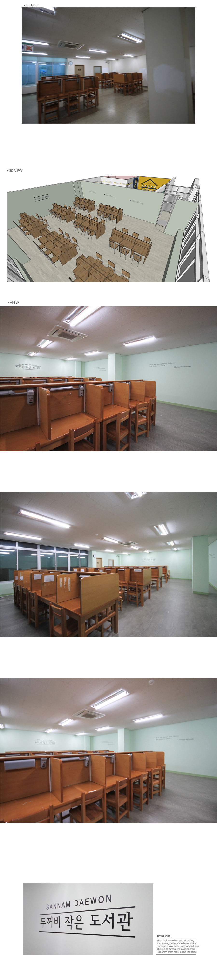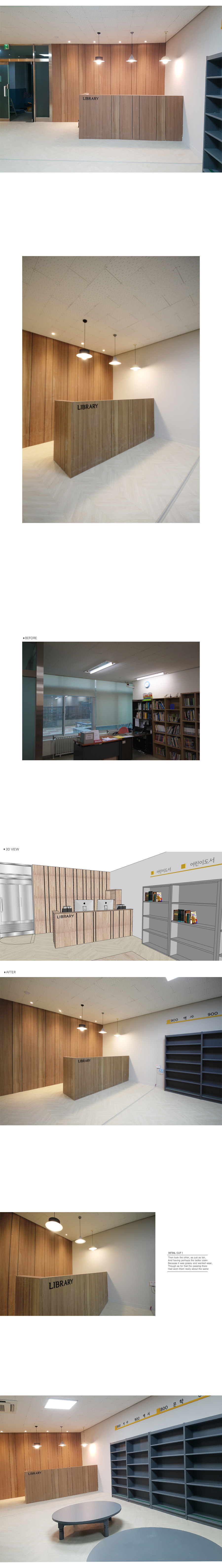 - ±âÁ¸¿¡ Ã¥»ó¸¸ ³õ¿©Á®ÀÖ´ø °ø°£À» º®¸é ²Ù¹Ò ÀÛ¾÷, Á¶¸í ½Ã°ø, Ä«¿îÅÍ Á¦ÀÛÀ» ÅëÇØ µ¶¸³ÀûÀÎ °ø°£À¸·Î ¼³°è.
