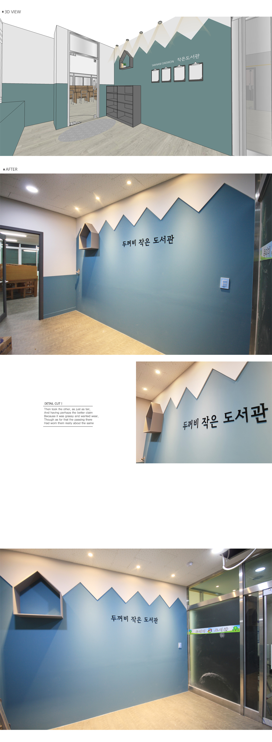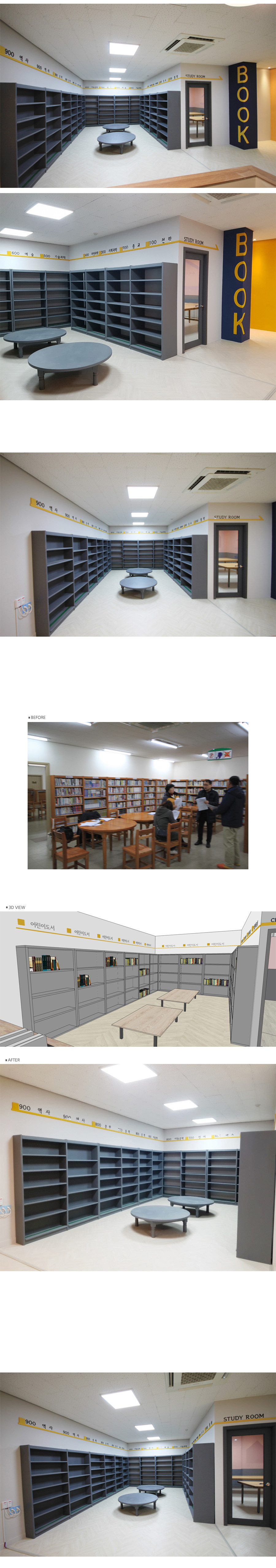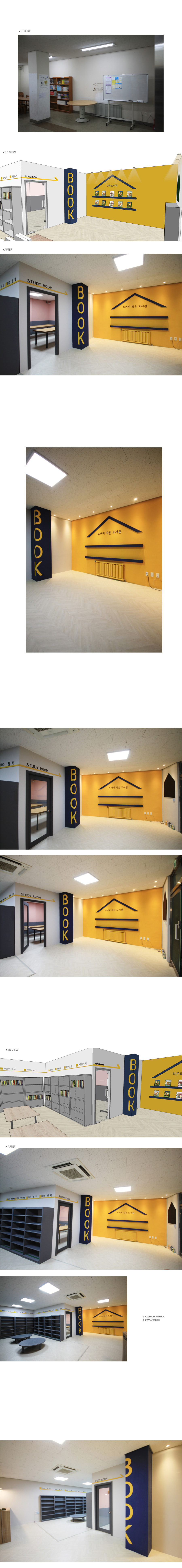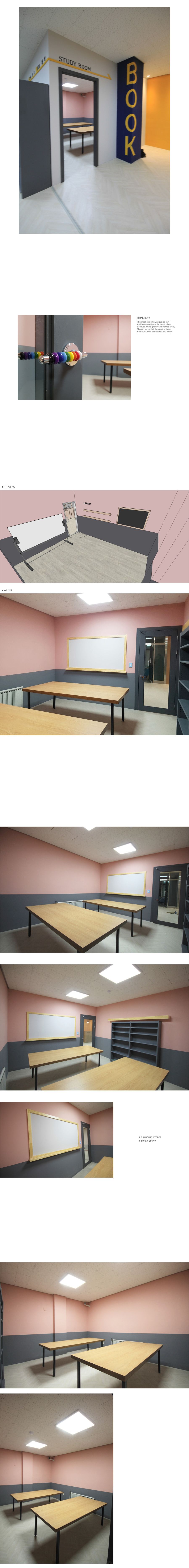 - ±âÁ¸¿¡ Ã¥»ó¸¸ ³õ¿©Á®ÀÖ´ø °ø°£À» º®¸é ²Ù¹Ò ÀÛ¾÷, Á¶¸í ½Ã°ø, Ä«¿îÅÍ Á¦ÀÛÀ» ÅëÇØ µ¶¸³ÀûÀÎ °ø°£À¸·Î ¼³°è.